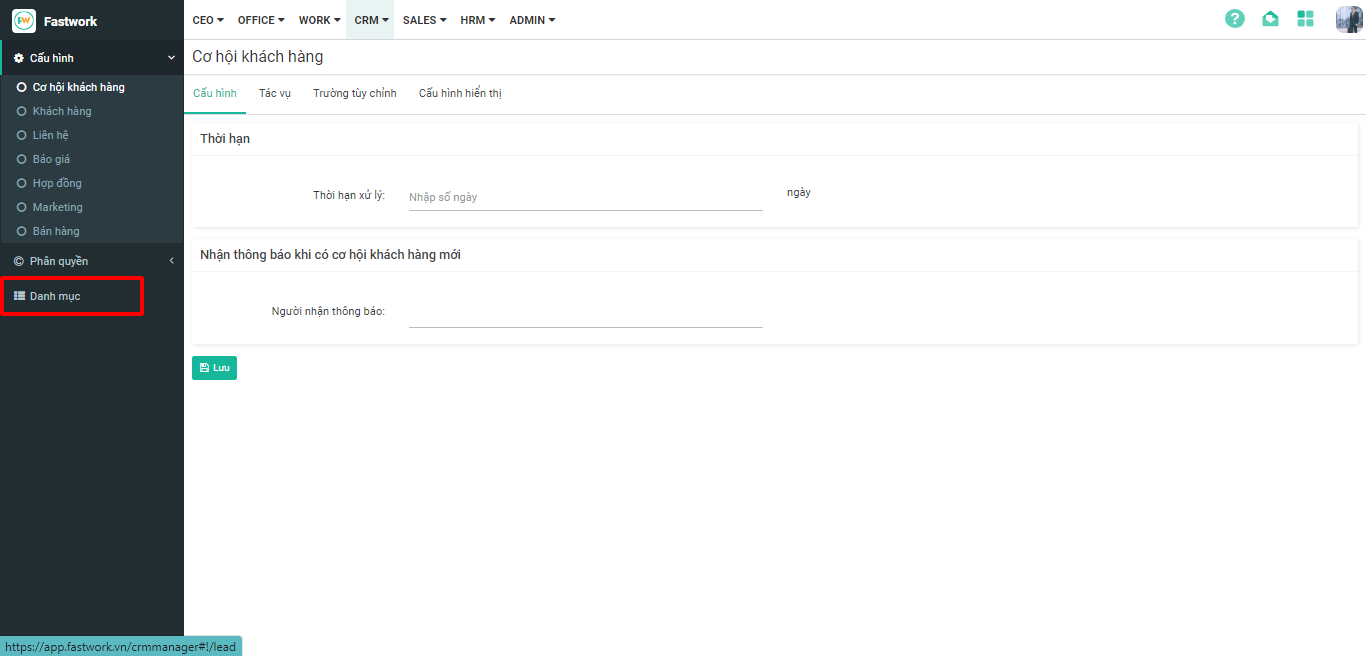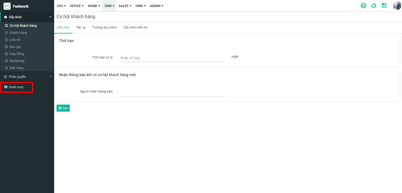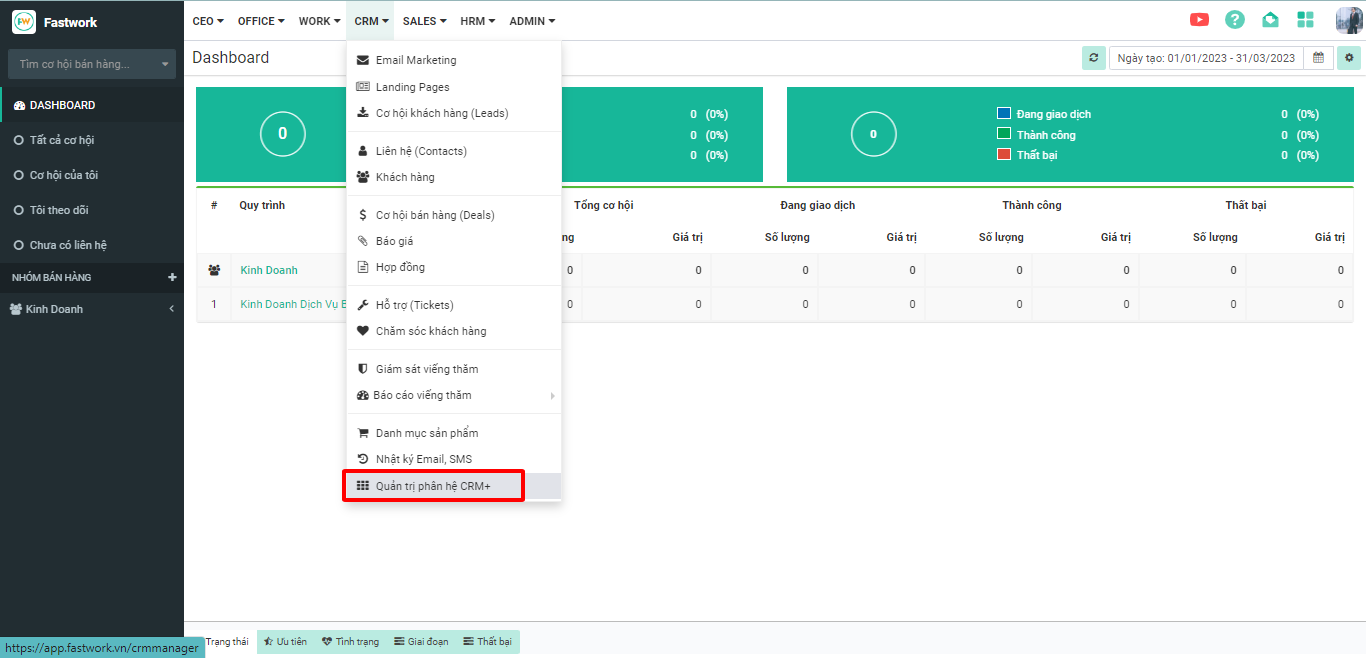 Bước 1 : Từ menu CRM chọn Quản trị CRM .
