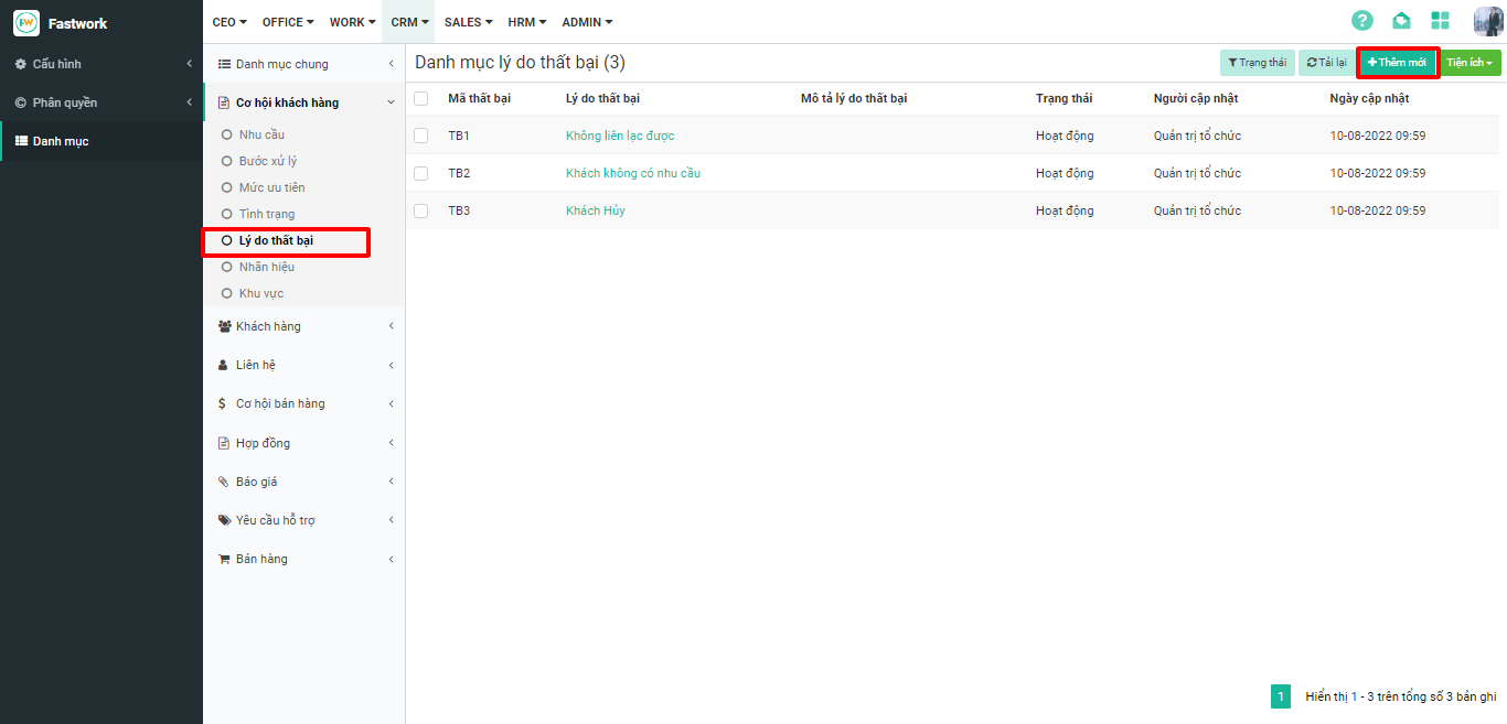 Bước 4 : Chọn Lý do thất bại, chọn Thêm mới