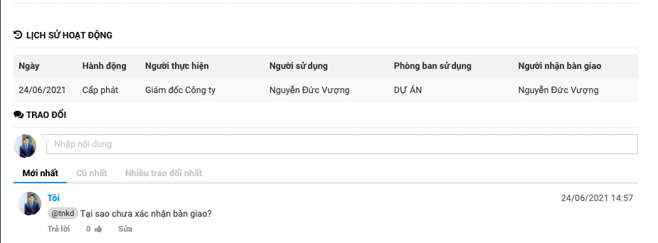 Trong 1 tài sản, có thể xem thống kê lịch sử hoạt động của tài sản đó, và khi cần trao đổi tương tác với những người có liên quan tới tài sản, anh/ chị cũng có nơi trao đổi trực tiếp ngay trên tài sản đó