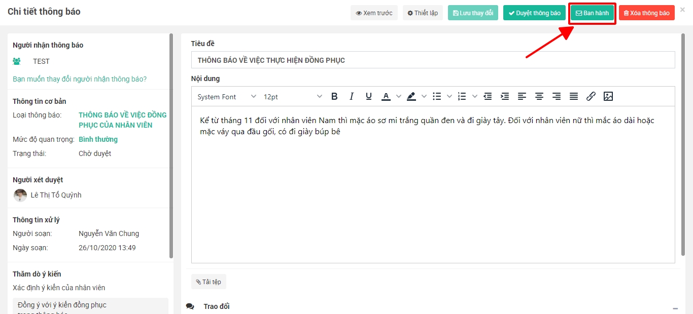 Bước 4: Bấm Ban hành để gửi thông báo đến toàn thể cán bộ/nhân viên trong doanh nghiệp
