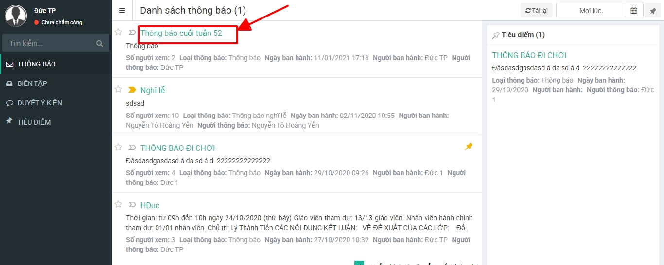 Bước 2: Vào Thông báo nội bộ cần duyệt ý kiến (Hoặc vào mục Duyệt ý kiến)
