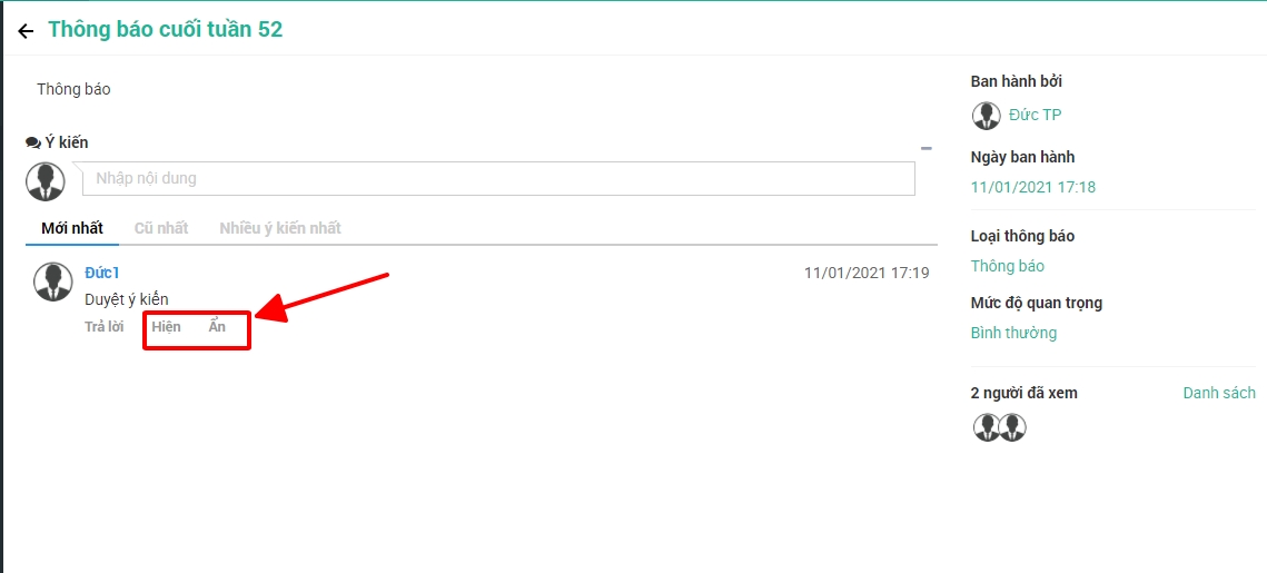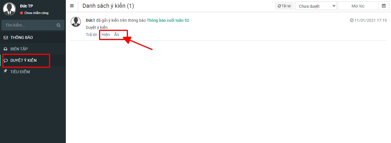 Cách 1: Trong thông báo ở phần trao đổi có hiện ý kiến của nhân viên nhưng chưa được duyệt, nếu đồng ý cho hiện nội dung trao đổi, người duyệt chọn "Hiện" ngược lại chọn "Ẩn"