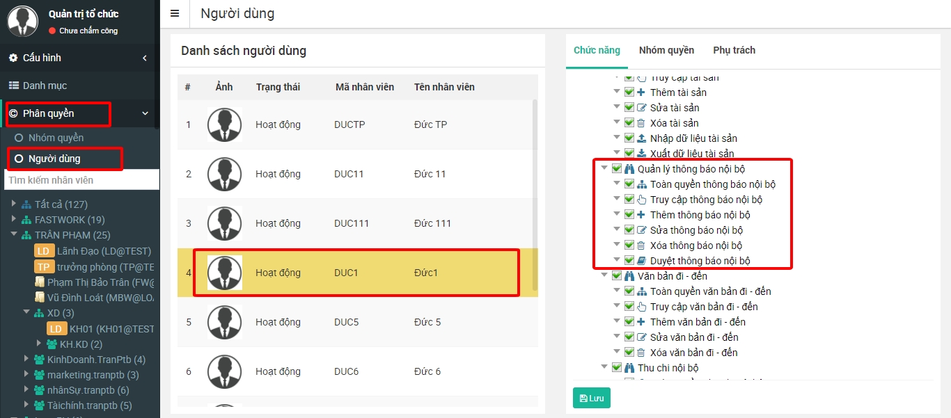 Bước 2: Trong giao diện quản trị phân hệ HRM+ -> chọn Phân quyền -> chọn Người dùng -> chọn nhân viên được chọn để truy cập thông báo -> tích những chức năng nhân viên được phép sử dụng truy cập trong thông báo -> chọn Lưu