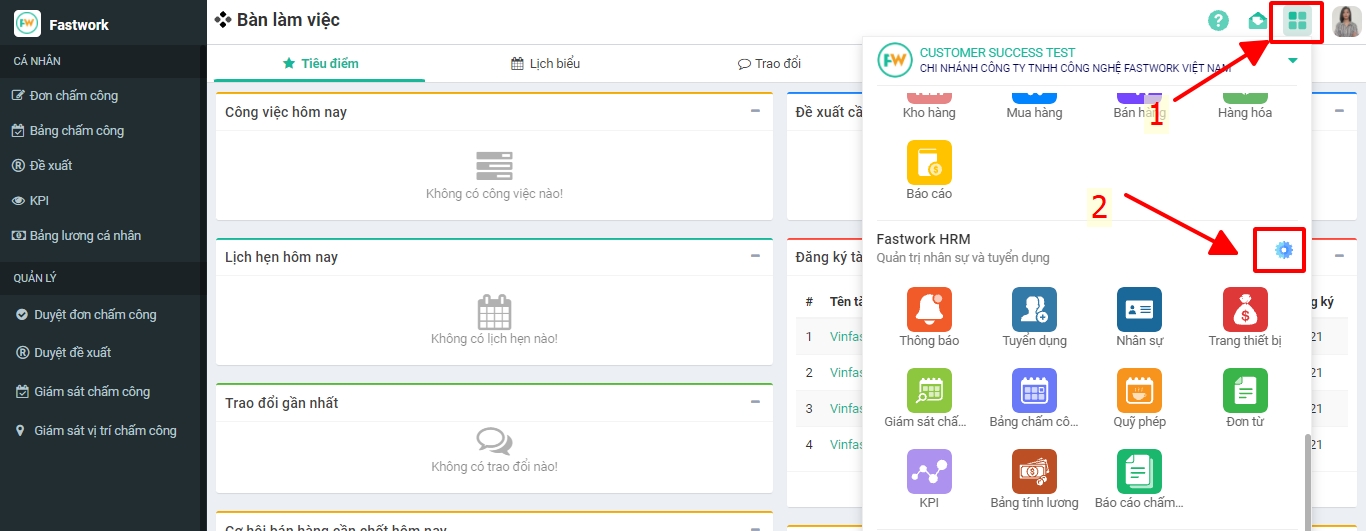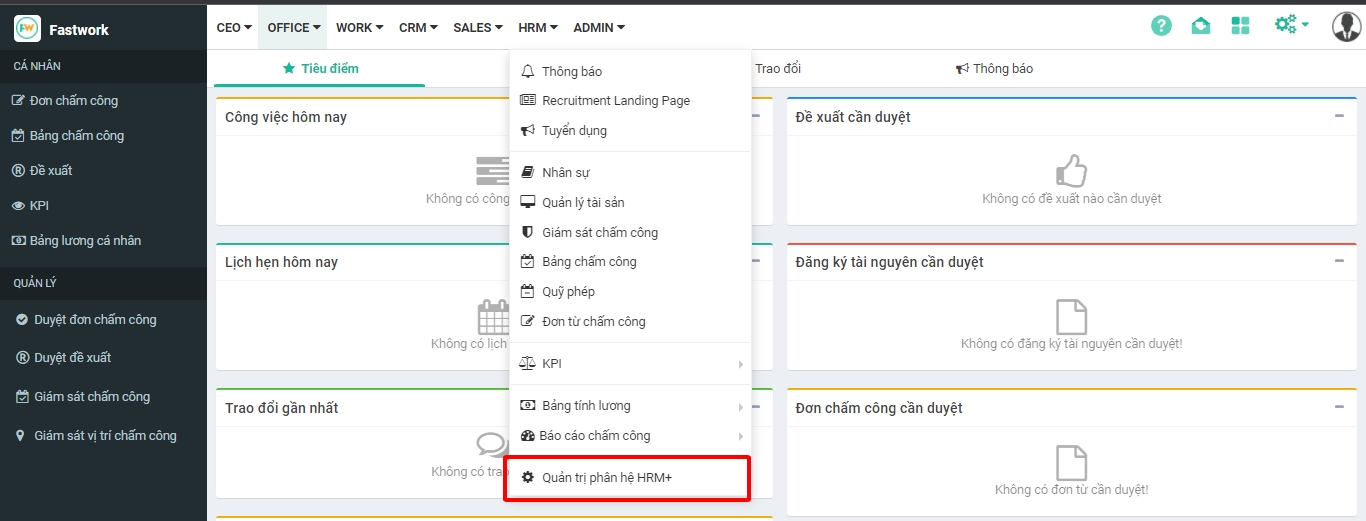 Bước 1: Chọn HRM -> chọn Quản trị phân hệ HRM+
