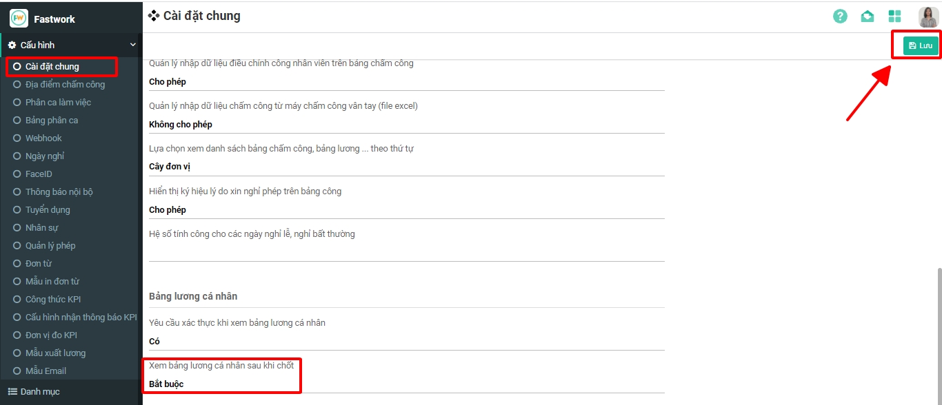 Ở mục Xem bảng lương cá nhân sau khi chốt -> chọn Bắt buộc -> Sau đó chọn Lưu để lưu lại cấu hình