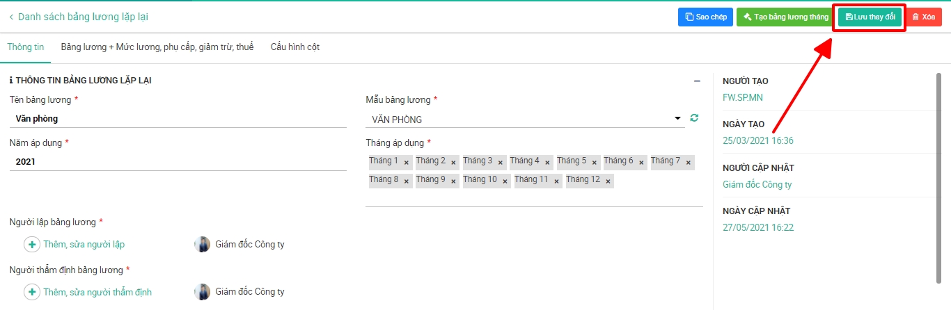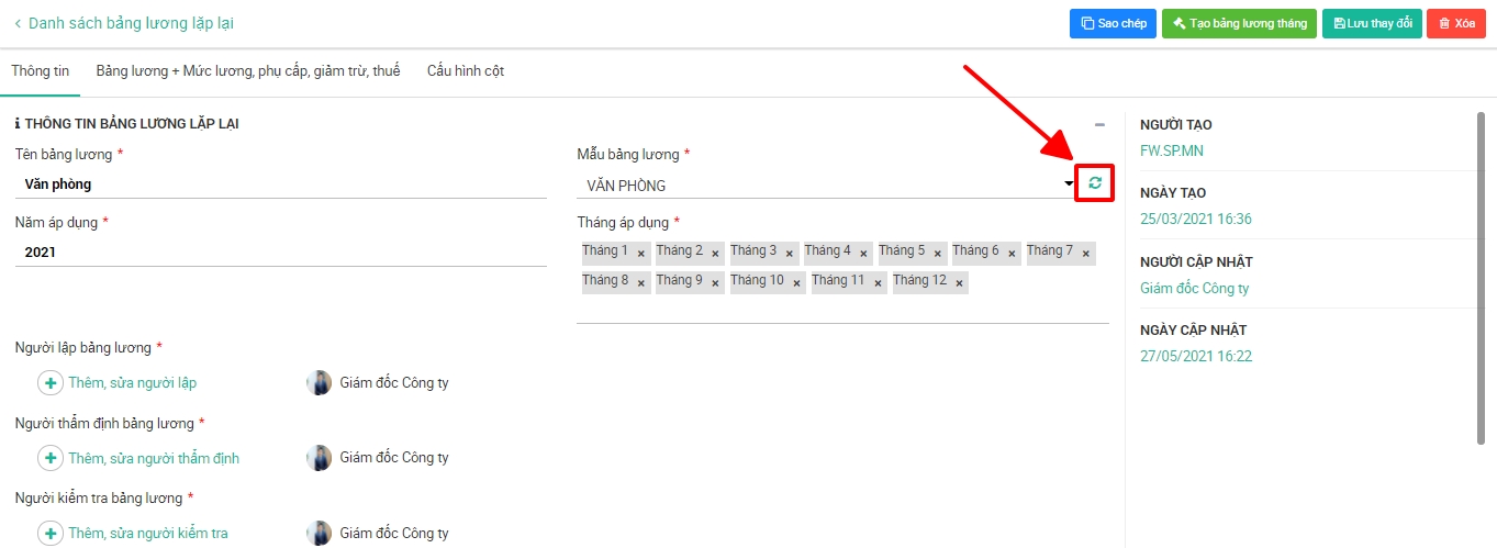 Bước 2: Sau khi đã điều chỉnh lại mẫu bảng lương, thực hiện cập nhật lại mẫu bảng lương trong bảng lương lặp lại