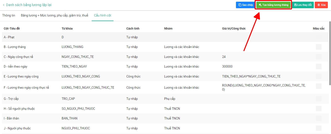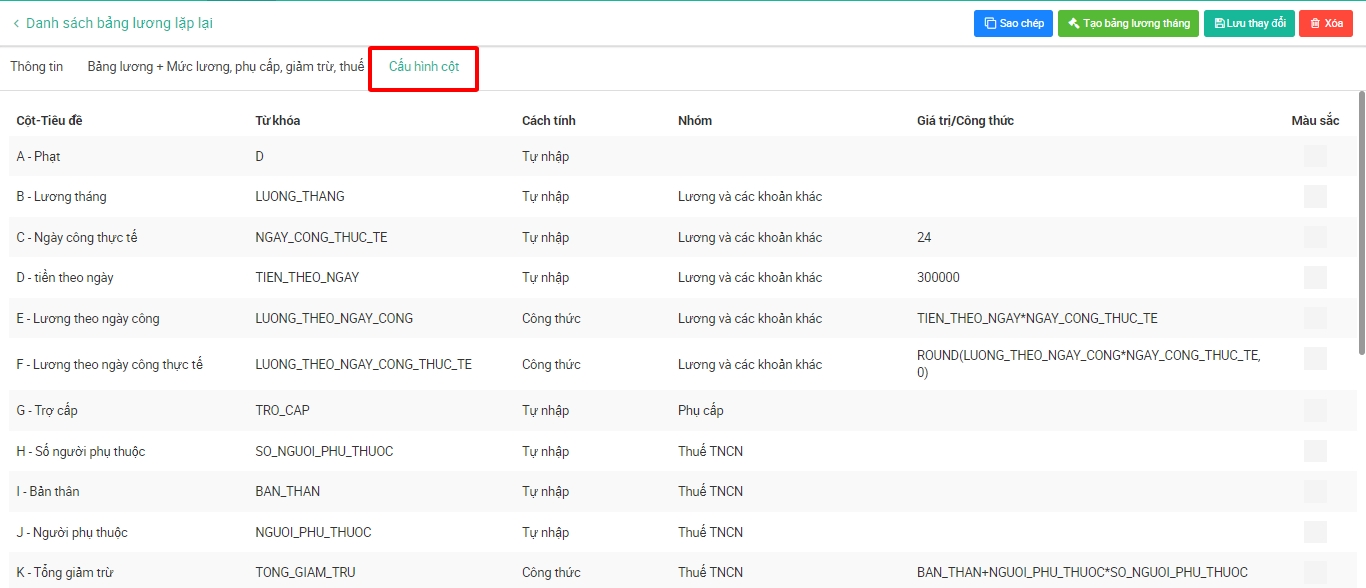 Bước 5: Sau khi lưu thay đổi xong, thực hiện tải lại trang để mẫu bảng lương mới được áp dụng. Để kiểm tra anh/ chị có thể lựa chọn sang tab Cấu hình cột để kiểm tra lại thông tin các cột trong mẫu bảng lương