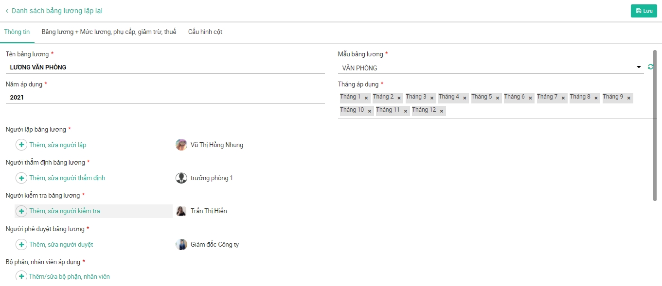 Bộ phận, nhiên viên áp dụng: Lựa chọn bộ phận và nhân viên sẽ tính lương theo mẫu bảng lương này