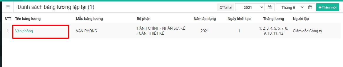 Bước 1: Chọn HRM -> chọn Bảng tính lương -> chọn Bảng lương lặp lại