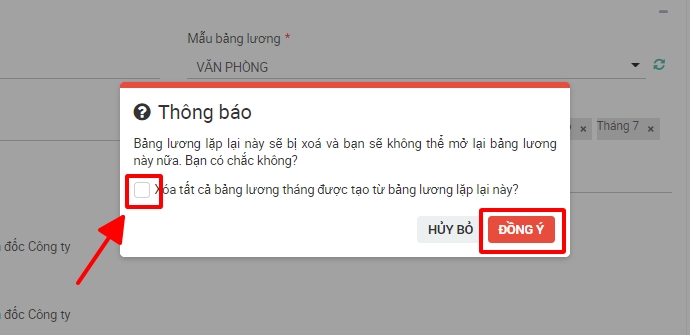 Nếu anh/ chị muốn xóa tất cả các bảng lương tháng được tạo ra từ bảng lương lặp lại này thì anh/ chị tích chọn ô checkbox "Xóa tất cả các bảng lương tháng được tạo từ bảng lương lặp lại này" -> chọn Đồng ý.