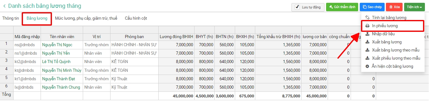 Bước 3: Chọn Bảng lương -> chọn Tiện ích -> chọn In phiếu lương