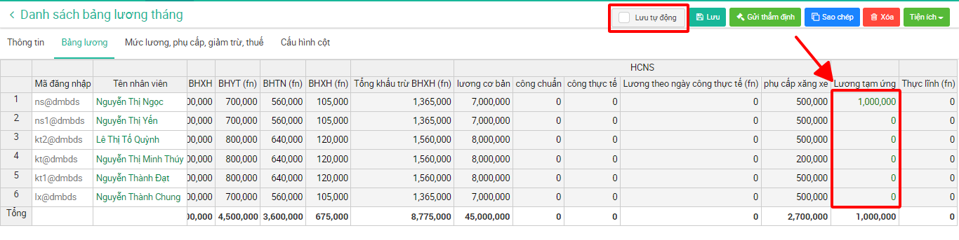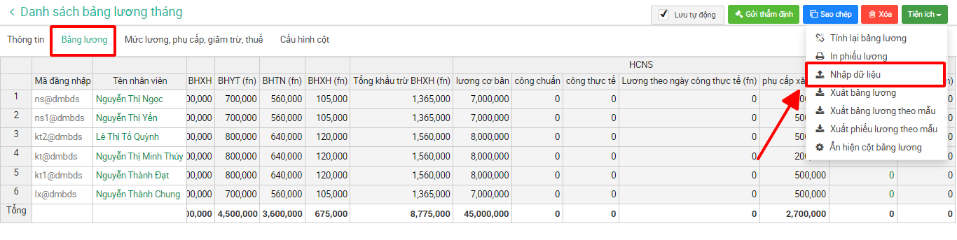 1. Hướng dẫn nhập giá trị vào bảng lương trực tiếp từ phần mềm