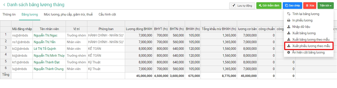 Hướng dẫn xuất phiếu lương tháng theo mẫu đã cấu hình