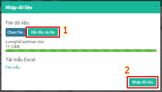 Bước 5: Sau đó chọn Bắt đầu tải file đợi dữ liệu load được 100% thực hiện chọn nút Nhập dữ liệu để đưa dữ liệu lên hệ thống