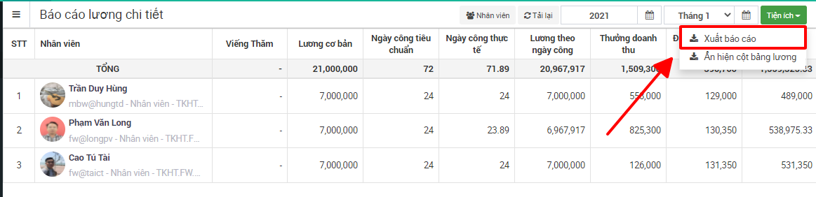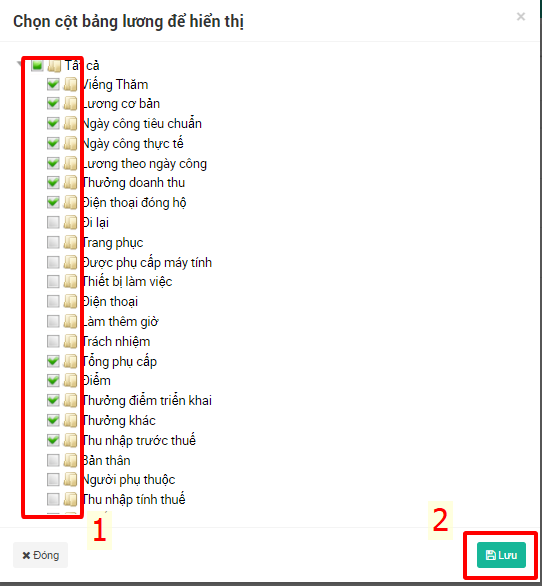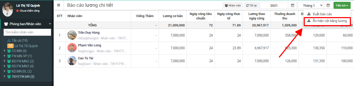 Hướng dẫn ẩn hiện cột bảng lương trong báo cáo lương chi tiết và xuất dữ liệu ra file excel