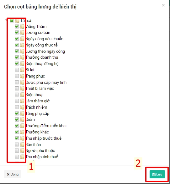 Bước 3: Thực hiện lựa chọn các trường thông tin muốn hiển thị ở báo cáo lương chi tiết sau đó chọn Lưu để lưu lại cấu hình