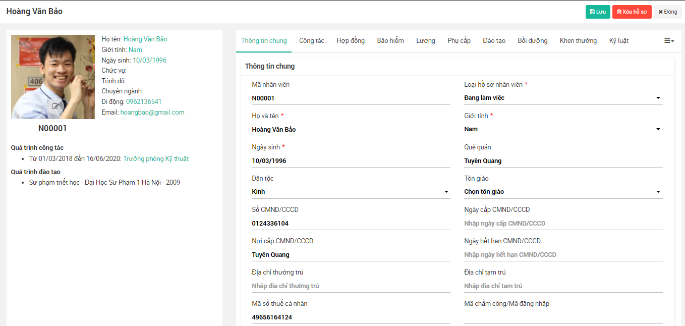 Quản lý chi tiết thông tin về người lao động như: Mã nhân viên, ngày tháng năm sinh, nơi sinh, giới tính, sổ bảo hiểm, địa chỉ, điện thoại, chỗ ở hiện nay, đơn vị công tác, chức danh công tác, chức danh nghề…
