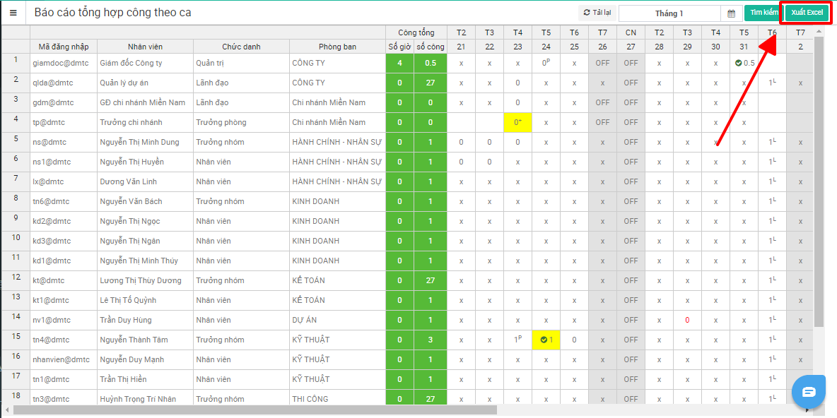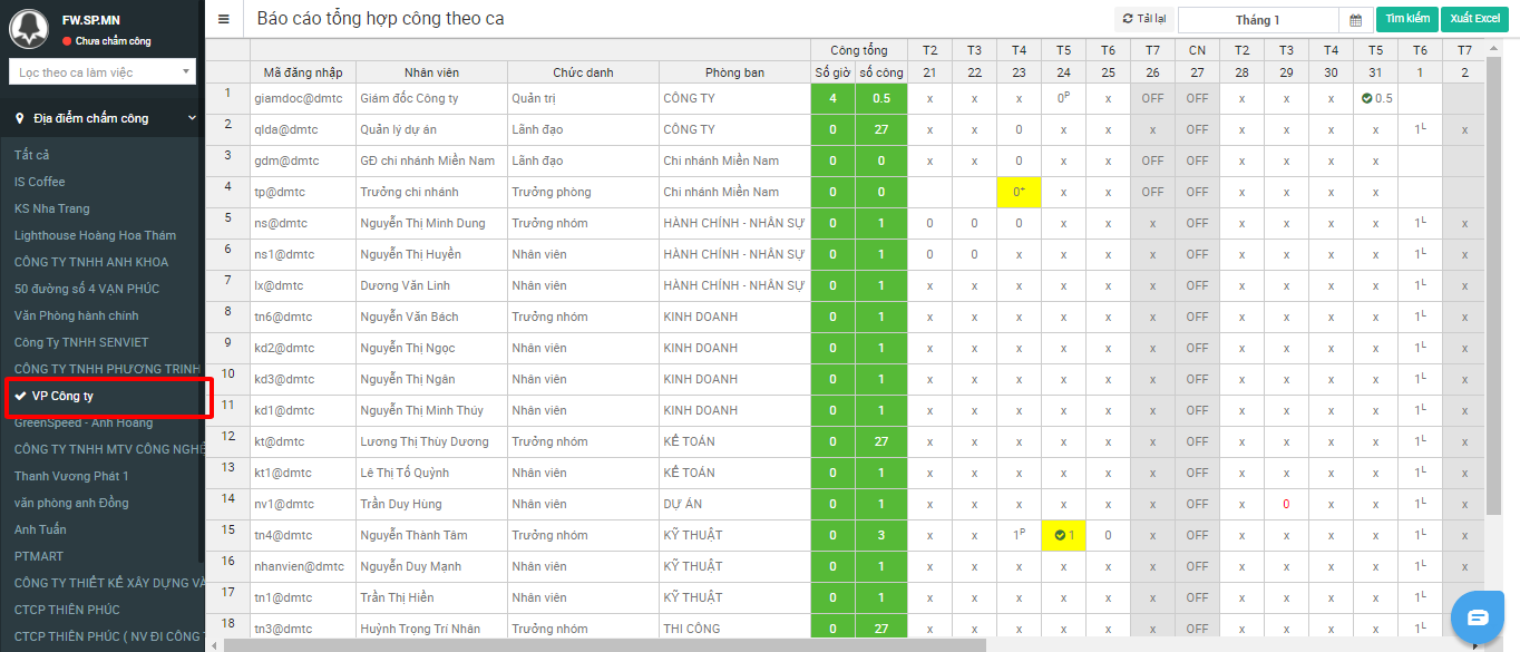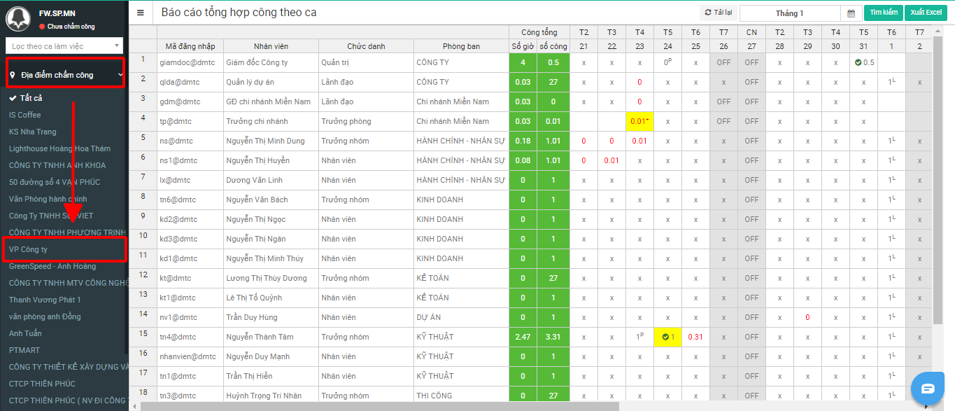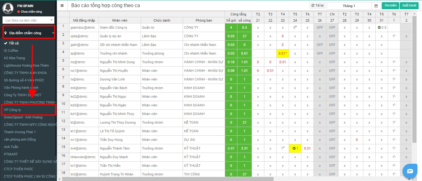 Hướng dẫn xem báo cáo tổng hợp số công theo từng địa điểm làm việc