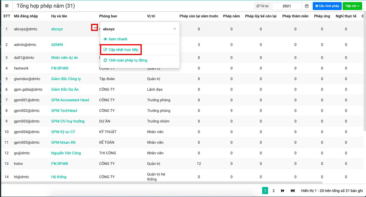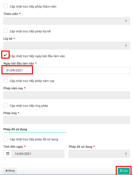 Cập nhật ngày bắt đầu làm việc trực tiếp để phần mềm phát sinh phép năm