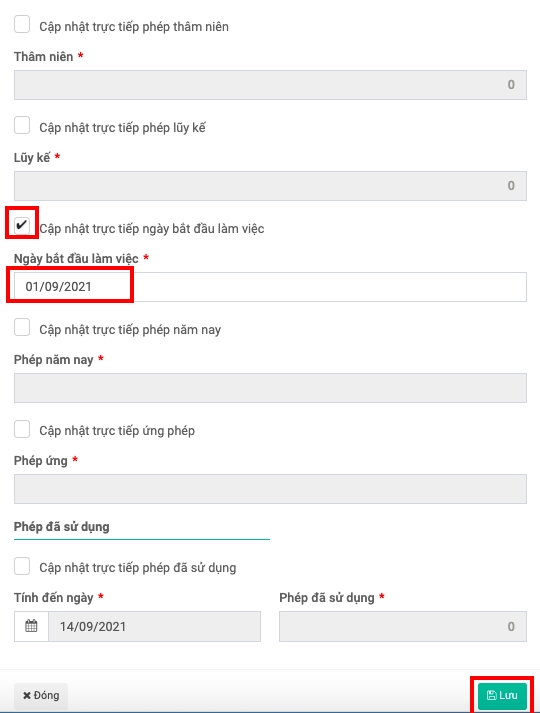 Bước 3: Tick chọn Cập nhật trực tiếp ngày bắt đầu làm việc -> Điền thời gian -> chọn Lưu