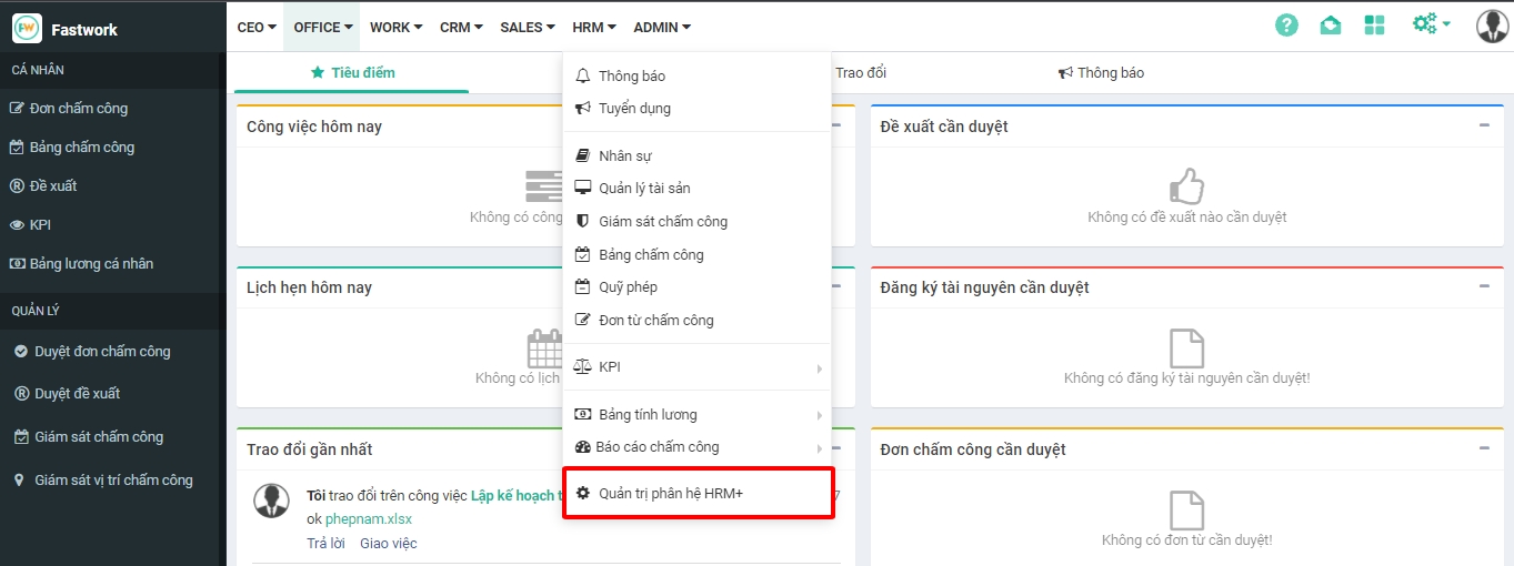 Bước 1: Chọn HRM -> chọn Quản trị phân hệ HRM+