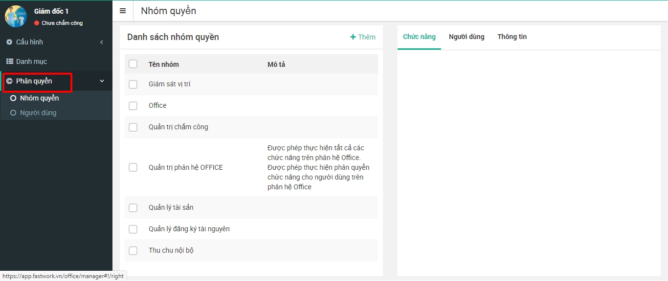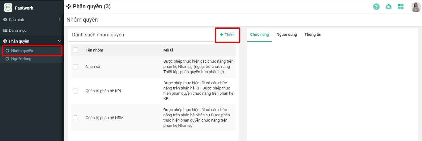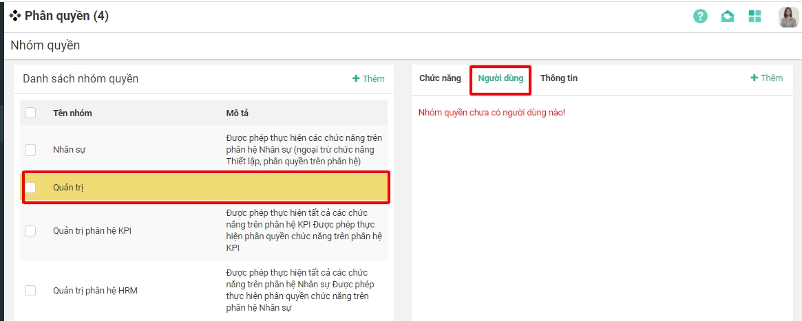 Bước 2: Chọn Nhóm quyền -> chọn Thêm để tạo nhóm quyền mới