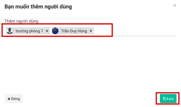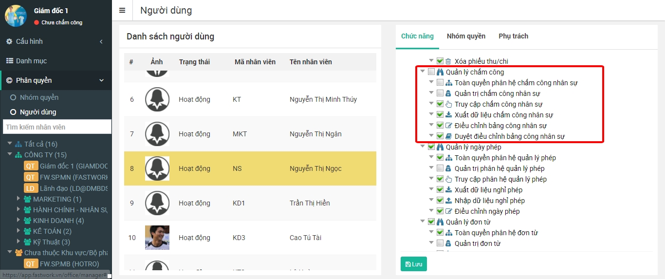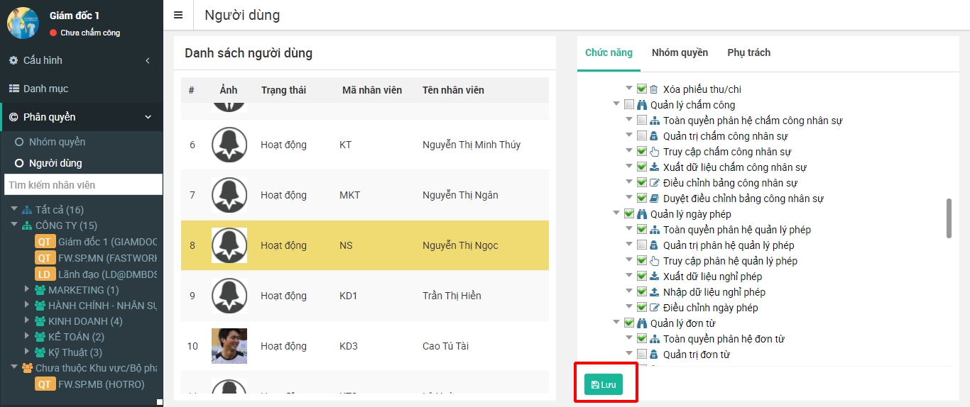 Bước 5: Chọn những tài khoản có quyền Quản trị chấm công -> Sau đó bấm Lưu