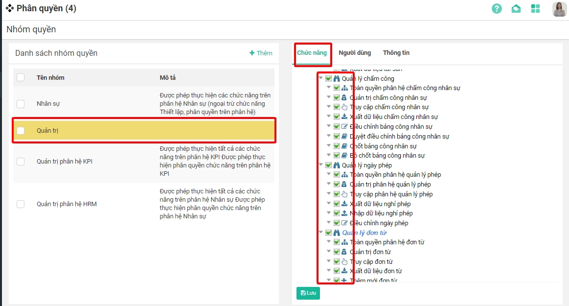 Bước 3: Chọn vào Nhóm quyền vừa tạo -> chọn đến Quyền Quản lý chấm công -> tích chọn các quyền chức năng tương ứng -> chọn Lưu để lưu lại quyền chức năng