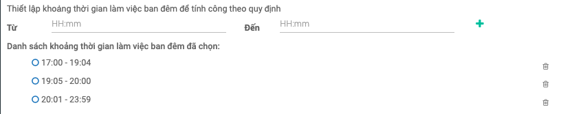 Thiết lập khoảng thời gian làm việc ban đêm để tính công theo quy định: Để tách khoảng thời gian làm thêm, nhằm hỗ trợ việc tính hệ số khác nhau bên bảng lương. (chỉ hỗ trợ tách khoảng thời gian với đơn xin làm thêm và tăng ca, không hỗ trợ tách thời gian cho ca làm việc chính)