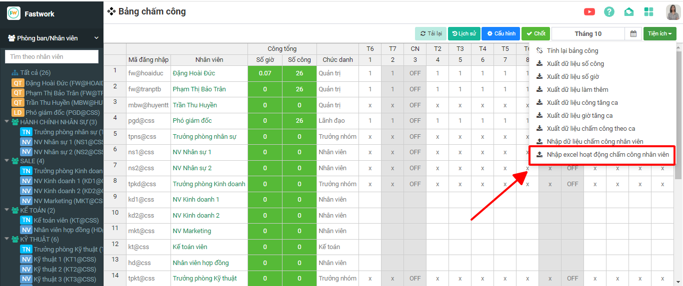 Cho phép: Trên bảng công, ở mục tiện ích sẽ có nút để nhập công cho nhân viên