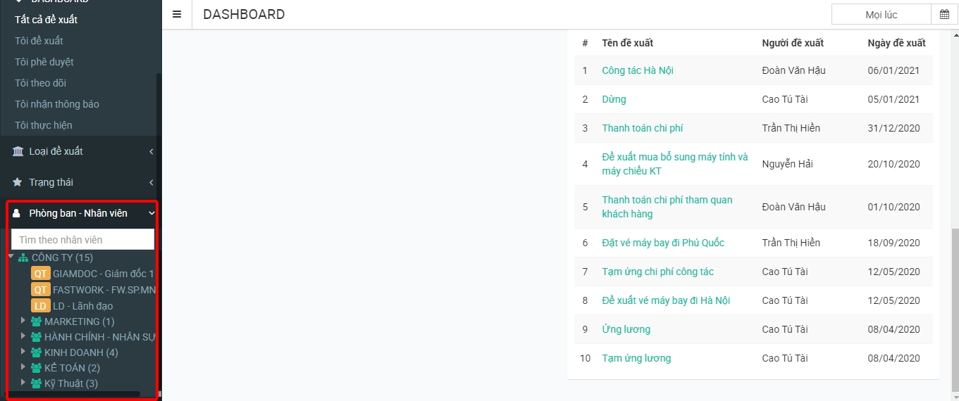 Phòng ban/Nhân viên: Lọc đề xuất theo phòng ban/nhân viên cần xem