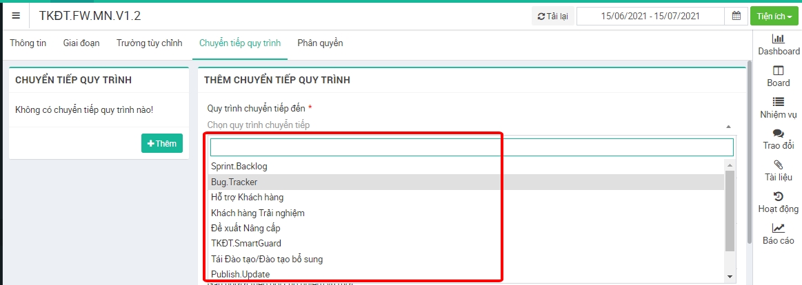 Trên thực tế làm việc sẽ có nhiều quy trình công việc có sự liên kết với nhau. Nhiệm vụ ở quy trình này sau khi xong hoặc đến một giai đoạn nào đó sẽ được chuyển sang một quy trình khác để thực hiện. Quy trình công việc workflow đã hỗ trợ người dùng tính năng chuyển tiếp quy trình. Để cấu hình chuyển tiếp, thực hiện như sau: