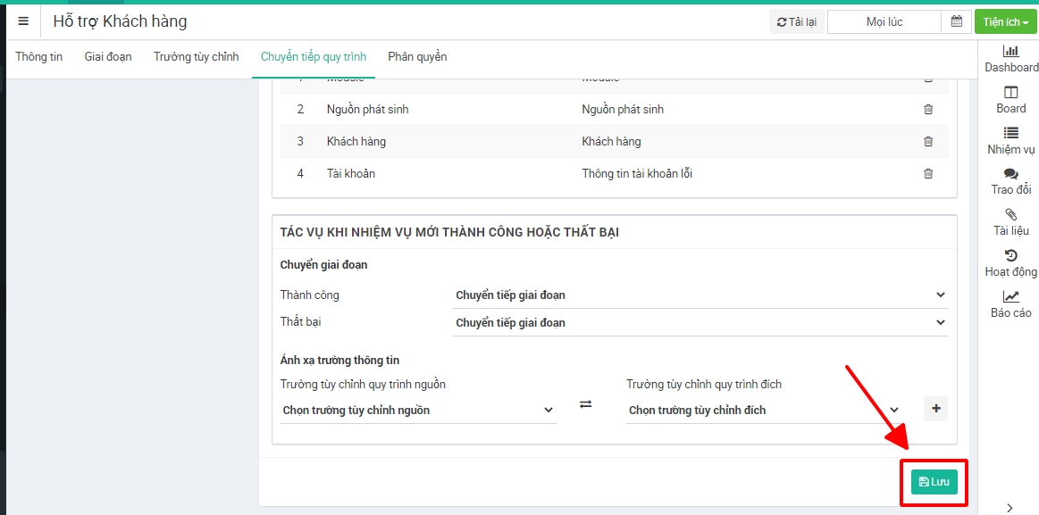 Sau khi điền đầy đủ thông tin chọn Lưu để lưu lại cấu hình chuyển tiếp quy trình