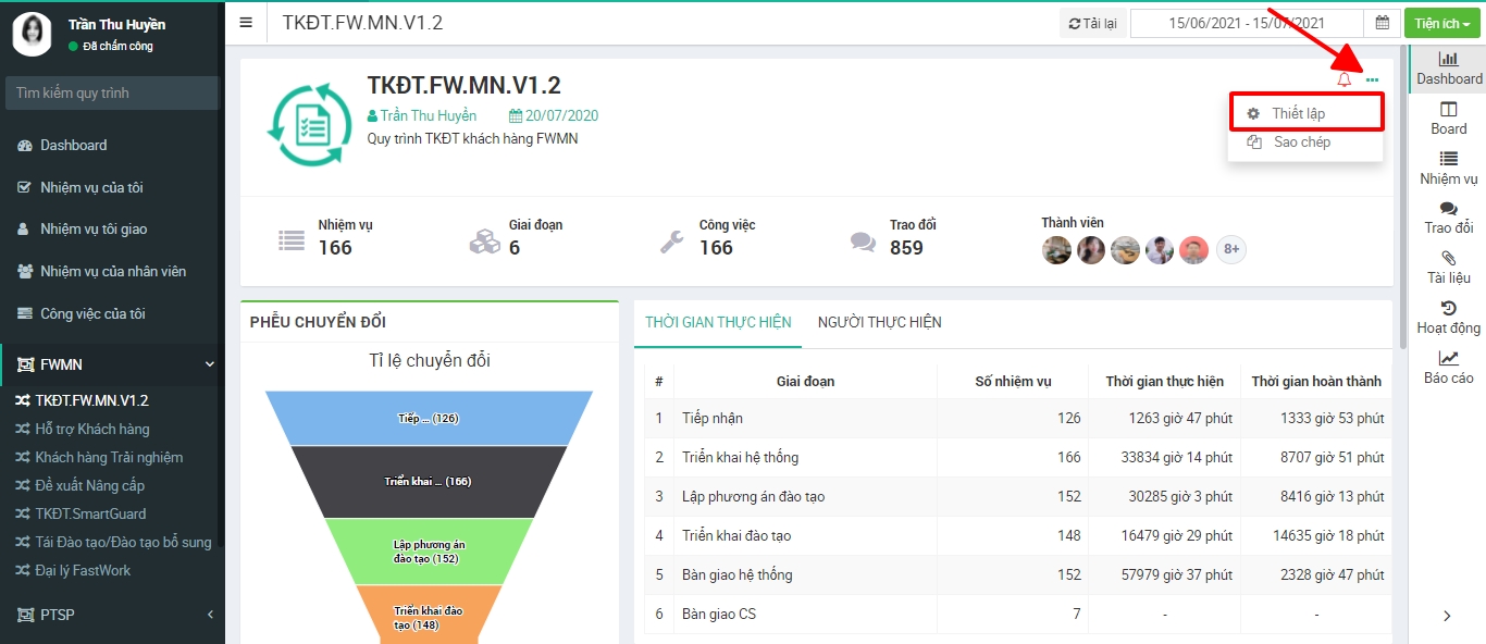 Bước 3: Ở giao diện Dashboard -> chọn dấu 3 chấm -> chọn Thiết lập
