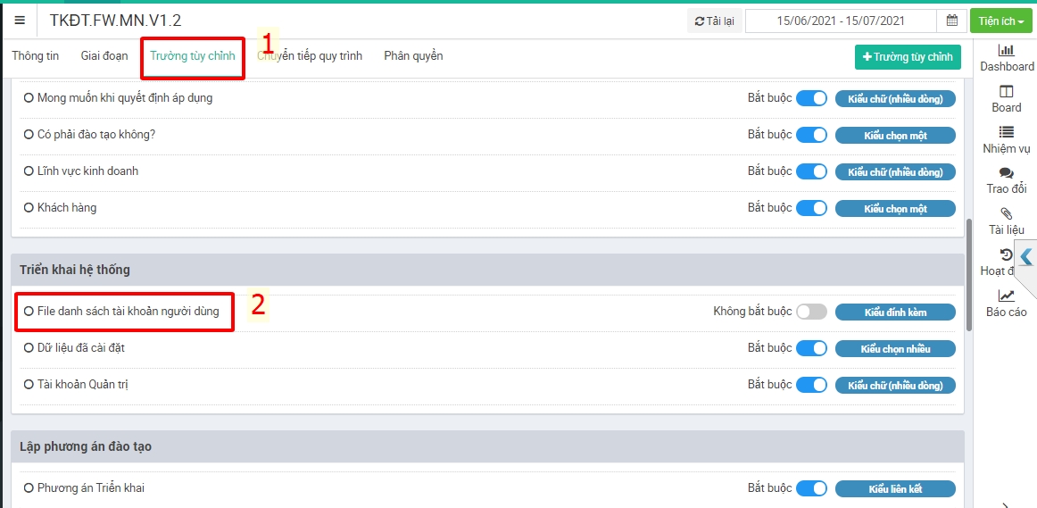 Bước 4: Chọn tab Trường tùy chỉnh -> chọn Trường tùy chỉnh cần sửa lại