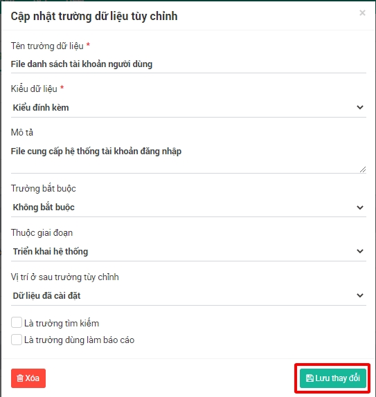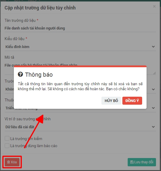 Để xóa trường tùy chỉnh -> chọn nút Xóa và chọn Đồng ý